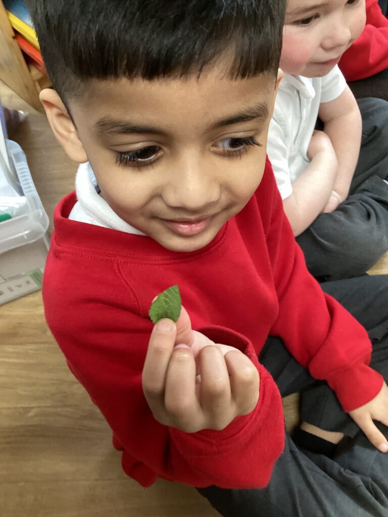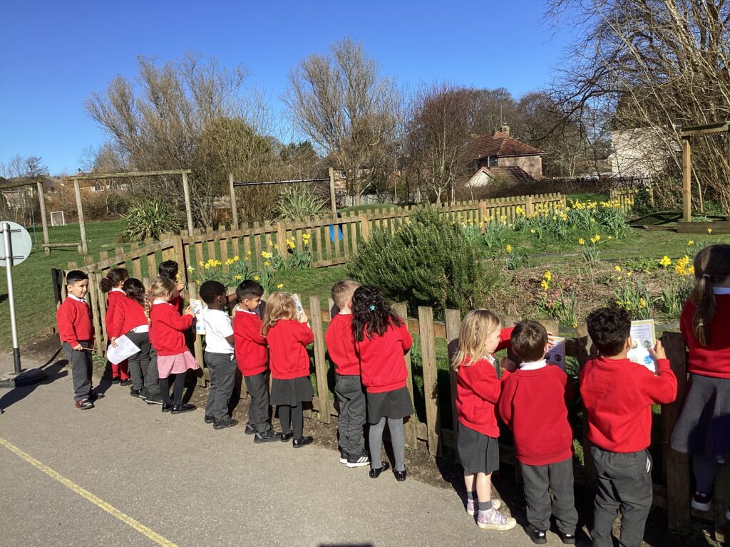 On our walk around the school grounds, we noticed lots of signs of Spring: velvety buds on our class tree, proud yellow daffodils, a clear blue sky and some wriggling minibeasts.