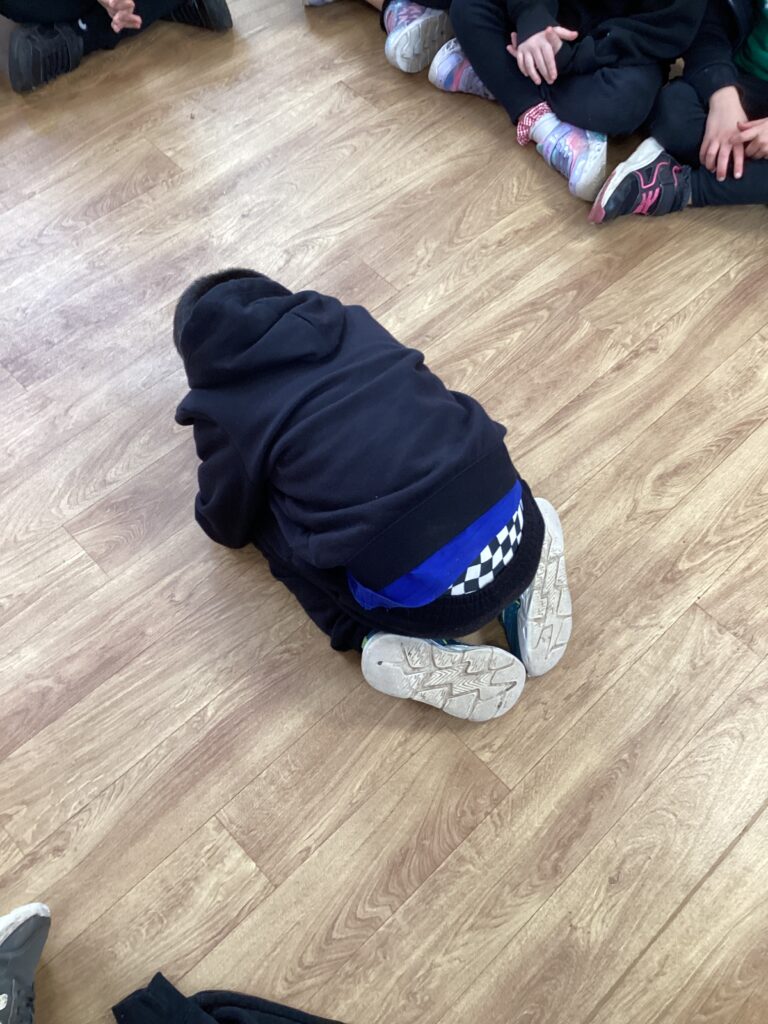 In PE on Wednesday, we woke up and stretched like a worm, wriggled and squirmed through the soil, pushed and pulled hard as the ground became firmer, curled into a small ball to fit through a tunnel, jumped over puddles, balanced on a bumpy log, froze when birds came overhead and rolled down the hill home. Tired, at last, the worms curled up and rested, breathing slowly.
