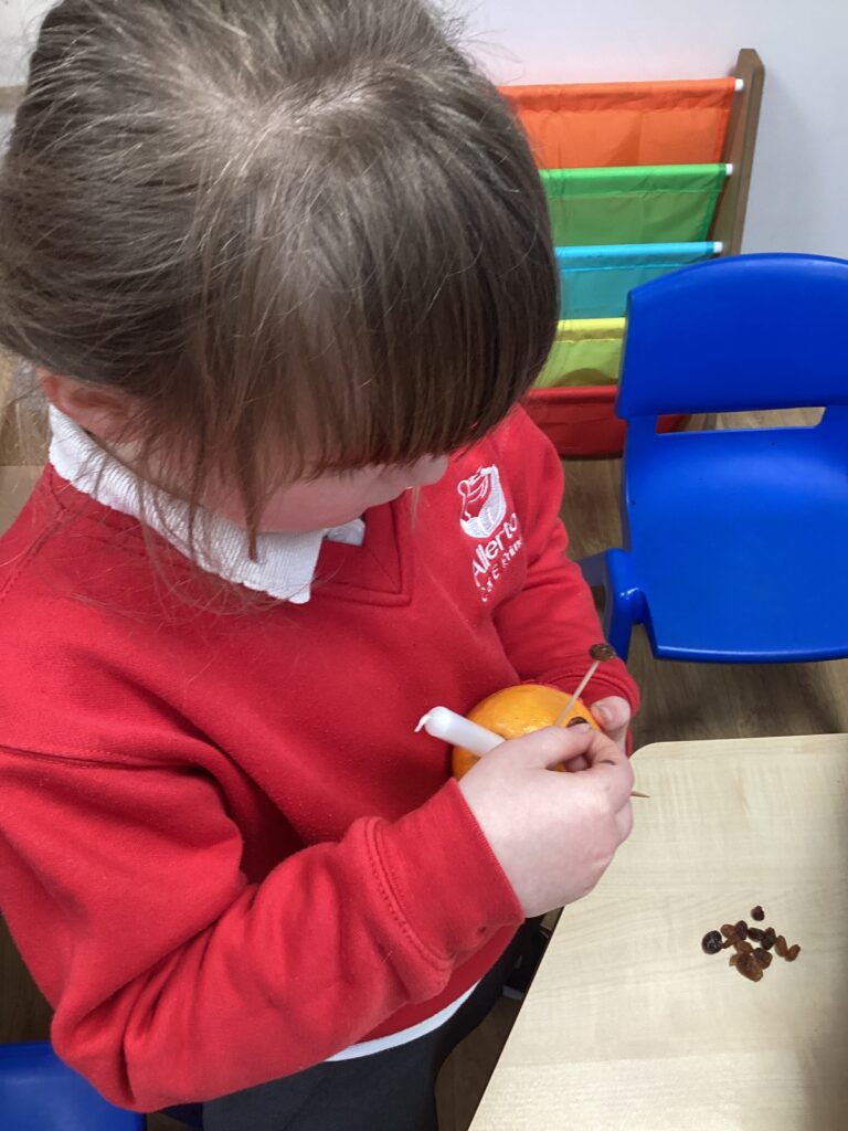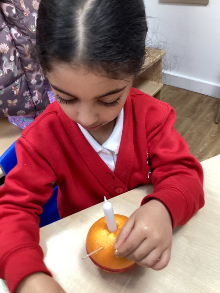 In preparation for our Christingles services on Friday afternoon, the children have been learning about the significance of Christingles. Some Christians believe that the orange represents the world, the raisins on sticks reflect the four seasons and the fruits of creation. Red tape represents the love of God. Jesus, the light of the world, shines through the candle.