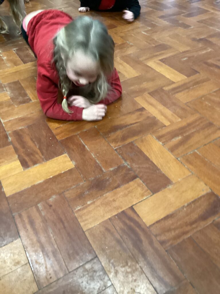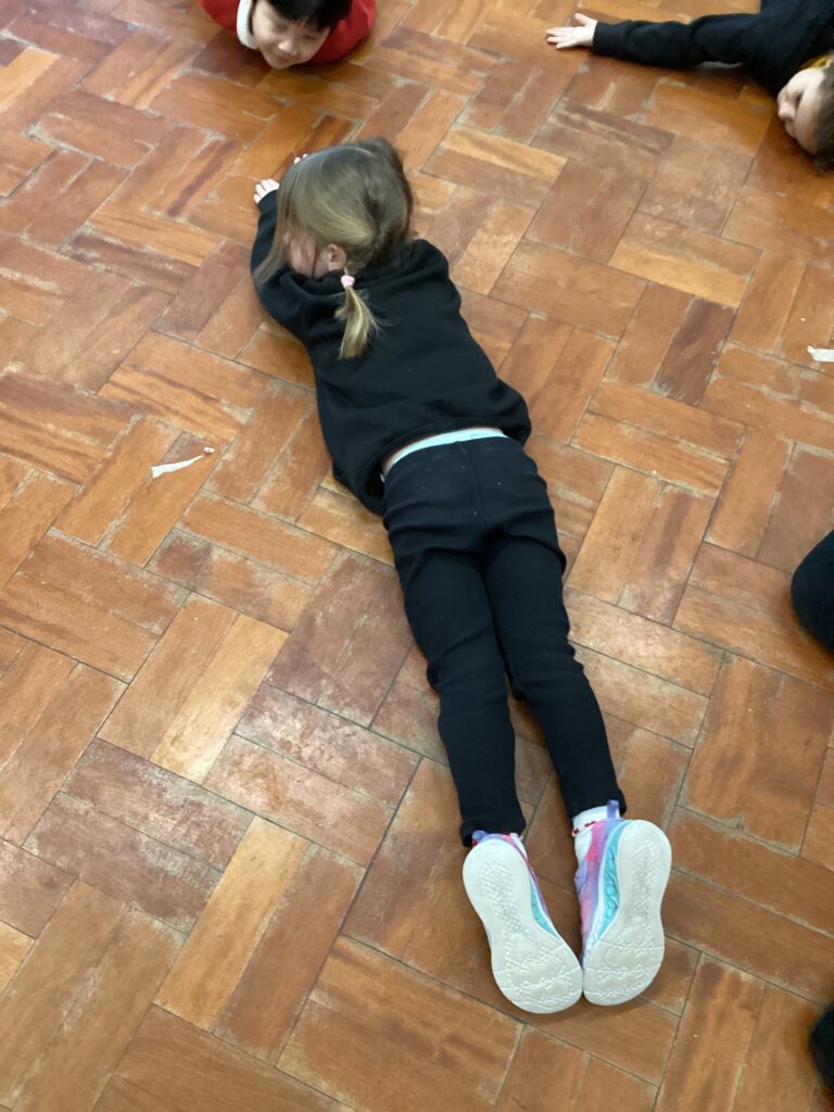 In PE on Wednesday, we woke up and stretched like a worm, wriggled and squirmed through the soil, pushed and pulled hard as the ground became firmer, curled into a small ball to fit through a tunnel, jumped over puddles, balanced on a bumpy log, froze when birds came overhead and rolled down the hill home. Tired, at last, the worms curled up and rested, breathing slowly.