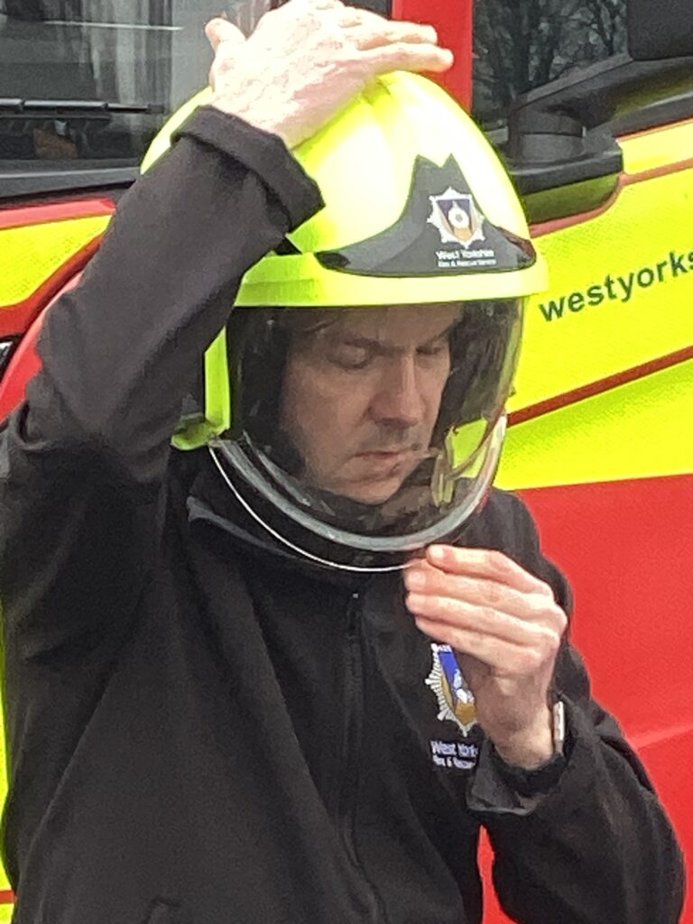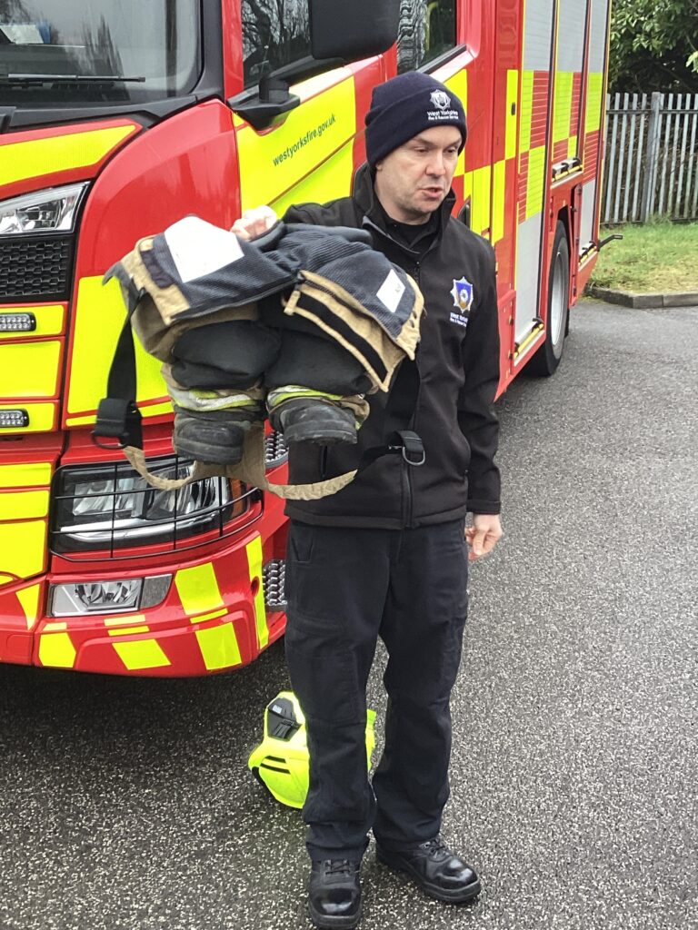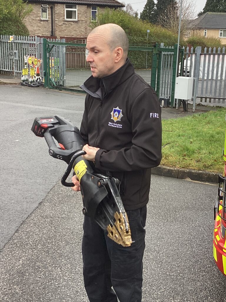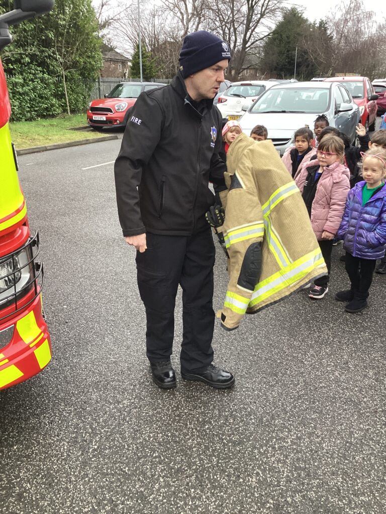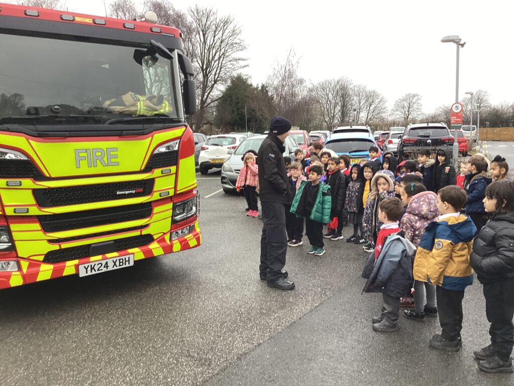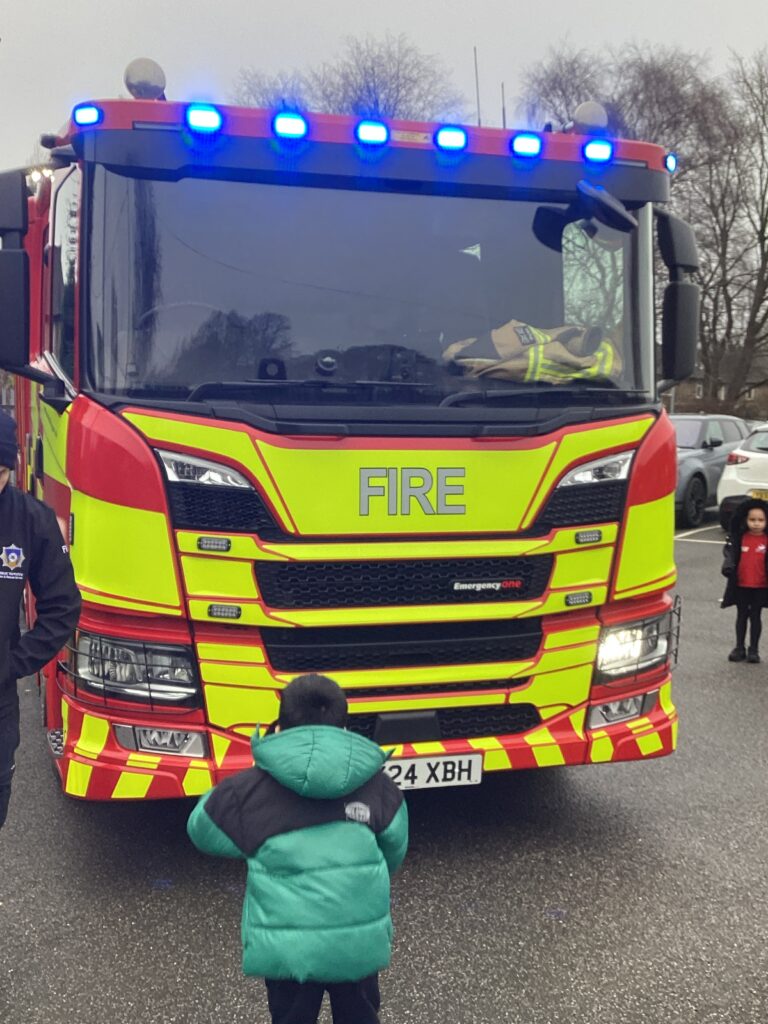 Today, we met firefighter Dan and his bright red fire engine. Moosa flicked on the secret button and the blue lights started to flash. We discovered that the long ladder helps Dan and his friends climb up tall buildings. We noticed that his trousers were attached to his boots, which makes them faster to put on in an emergency. His helmet has a strong visor to protect his eyes and face. He explained that, as well as rescuing people from fires, firefighters also rescue people when they are trapped in cars. Can the children show you which piece of equipment is used for opening cars up?